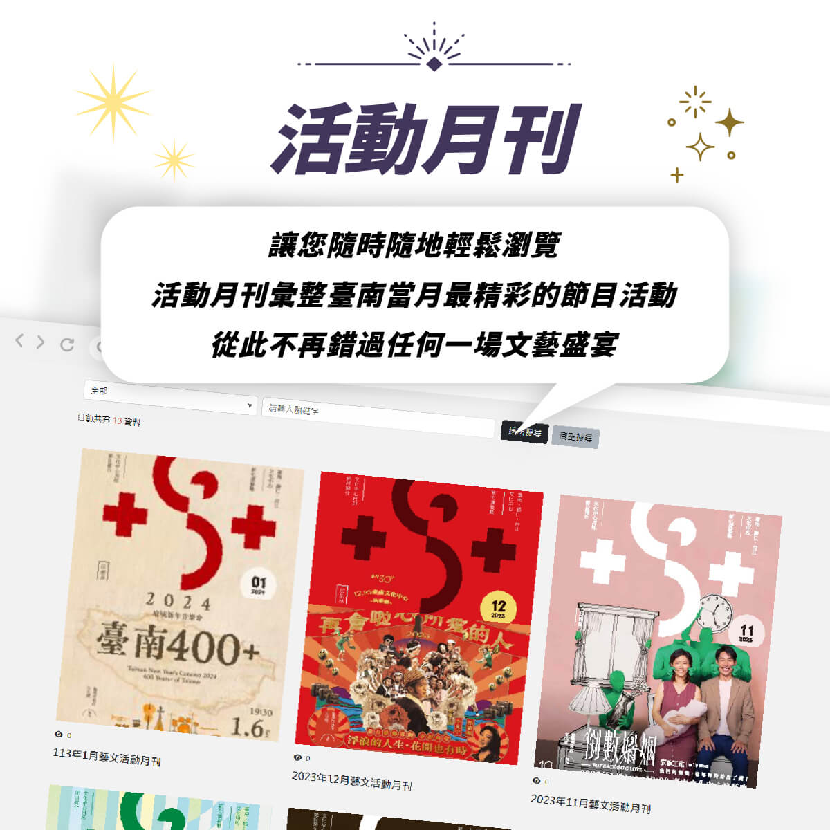 誠摯邀請大家多加瀏覽利用,感受臺南文化中心的魅力!。